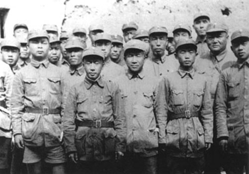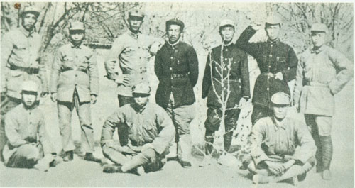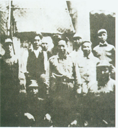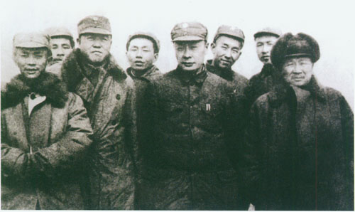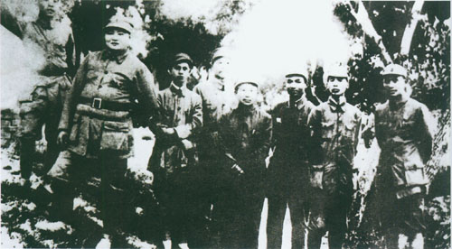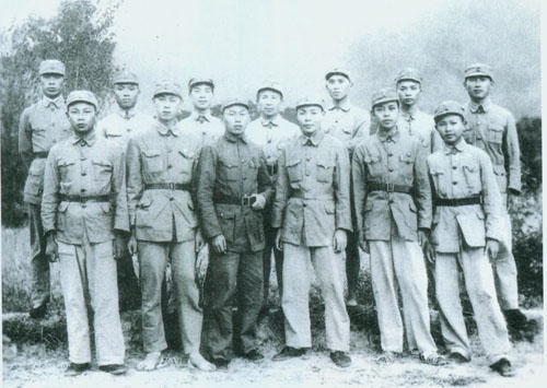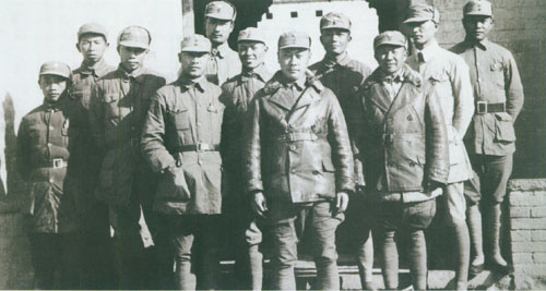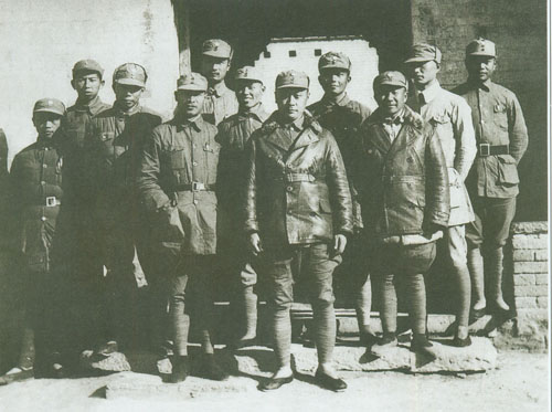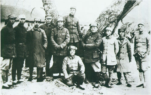 31.张云逸1941.11.18同新四军部分干部在淮北泗阳县新四军第九旅旅部门前之合影。右起:朱茂绪、张爱萍、张云逸、冯定、陈毅、韦国清、张震、彭雪枫、张震球。