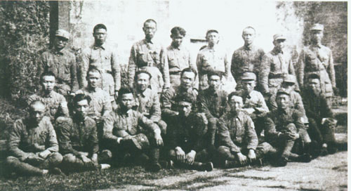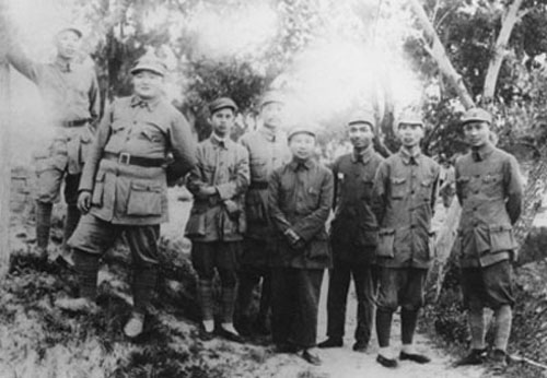 23.张云逸1939.5时任新四军参谋长(前排左六),与军长叶挺(左五)、政治部副主任邓子恢(左四)等从皖南渡江北上筹建江北指挥部,在庐江东汤池合影。