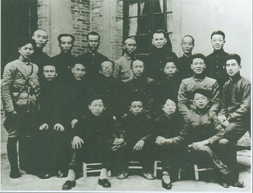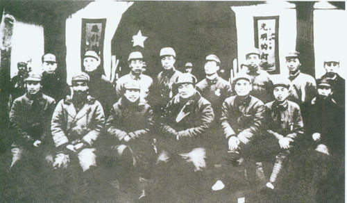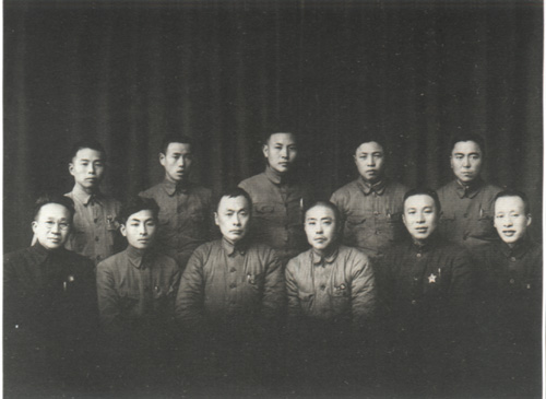 29.张云逸1941.3.18与新四军第二师在安徽天长县赵庄召开政工会议会议主席团全体成员之合影。前排左起:张劲夫、郑位三、张云逸、罗炳辉、周骏鸣、殷绍礼、梁国斌。后排左起:邓子恢、杨每生、张树才、龙潜、张凯、饶守坤、徐祥亨。