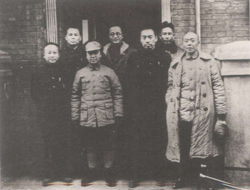 40.张云逸1945.10.20在山东临沂与新四军部分领导人之合影。左起:舒同、张凯、黎玉、胡立教、陈毅、石文、薛丹洗、张云逸。