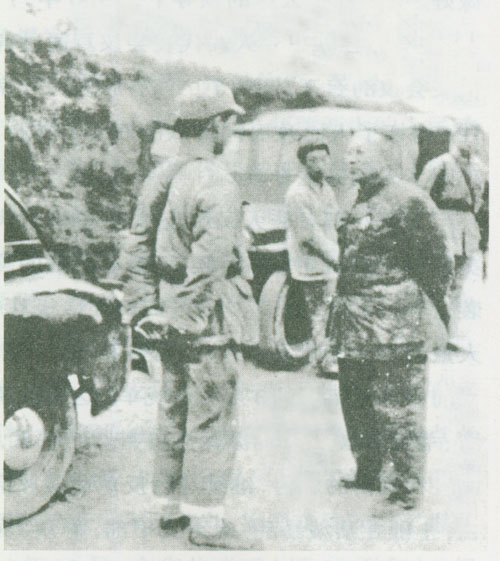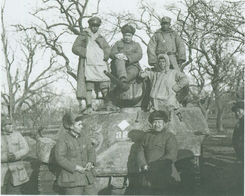 44.张云逸1947.1在鲁南战役大捷中缴获的坦克前留影。坦克上中坐者为陈毅,坦克前立者右为张云逸,左为张鼎丞。