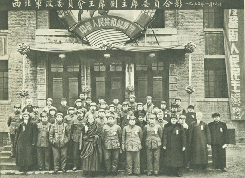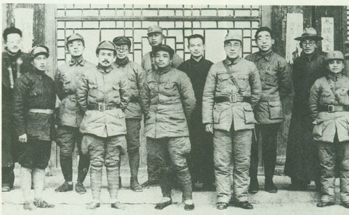 18.彭德怀1937.1西安事变发生后为前敌总指挥,和任弼时(左四)、杨尚昆(左三)、陆定一(左五)等与前来访问的国民党友军将领在陕西三原县合影。