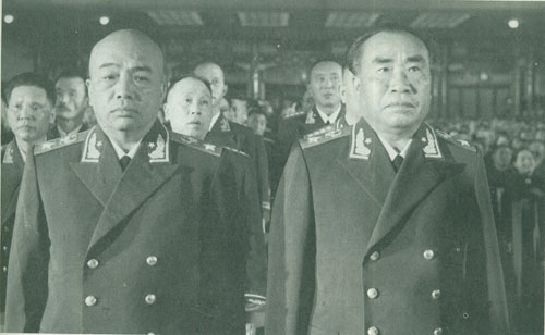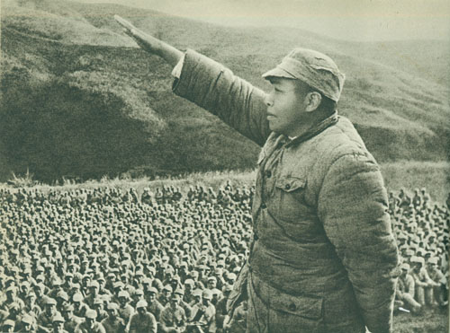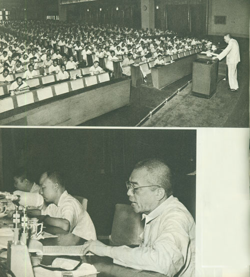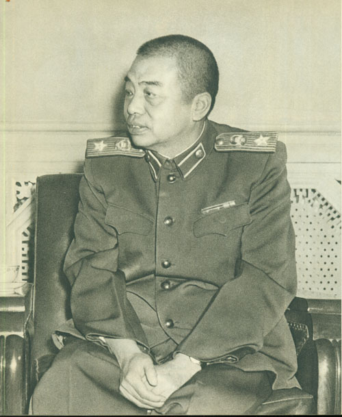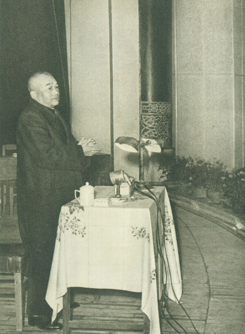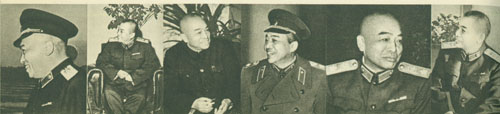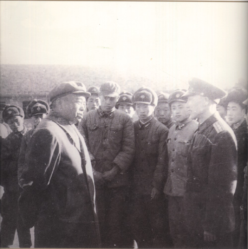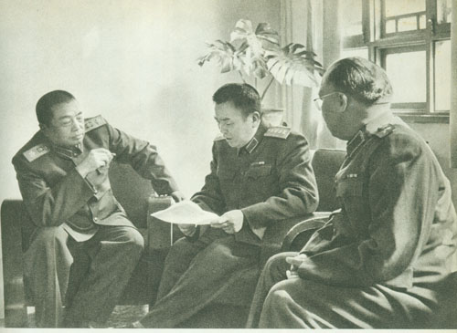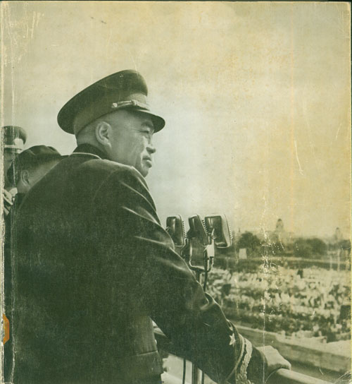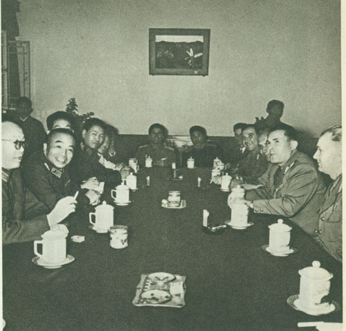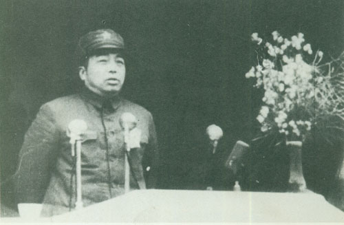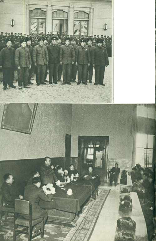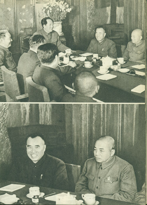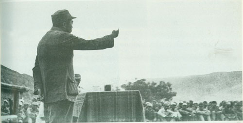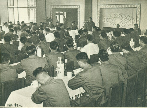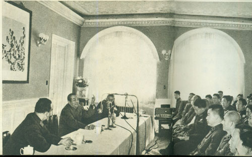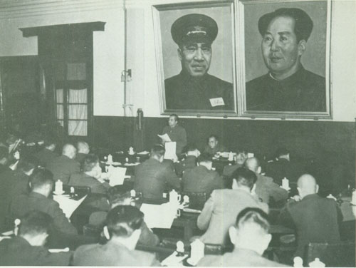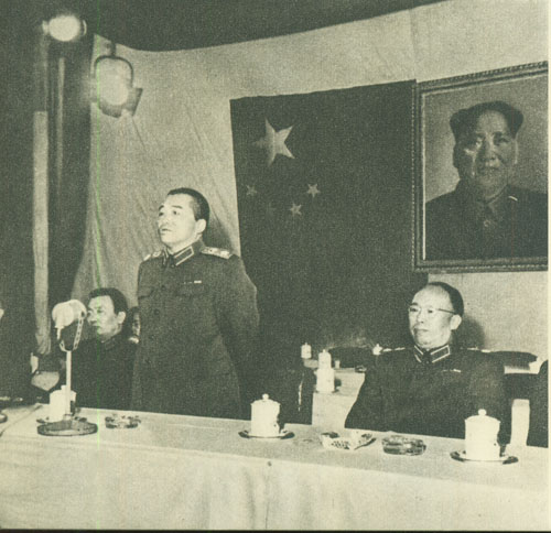223.彭德怀1957.10.5在北京饭店向参加国庆观礼的志愿军全体代表讲话。左为志愿军司令员杨勇上将,右为政治委员王平上将。