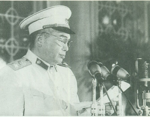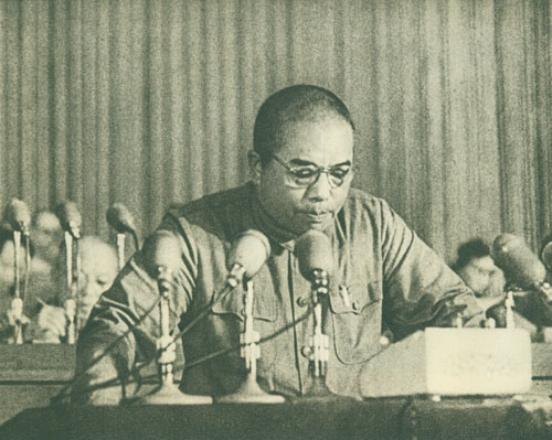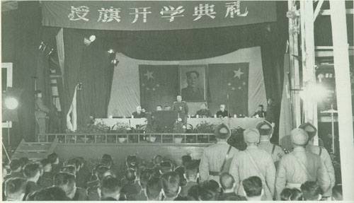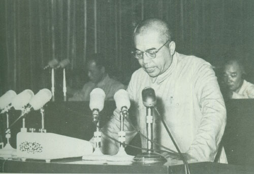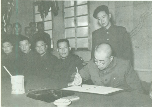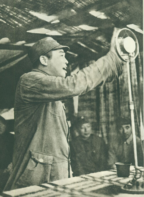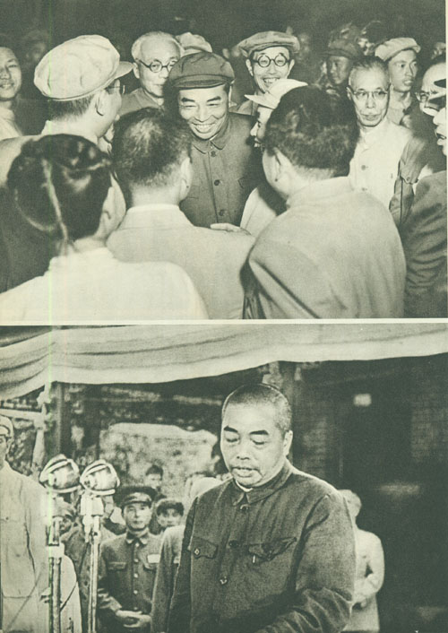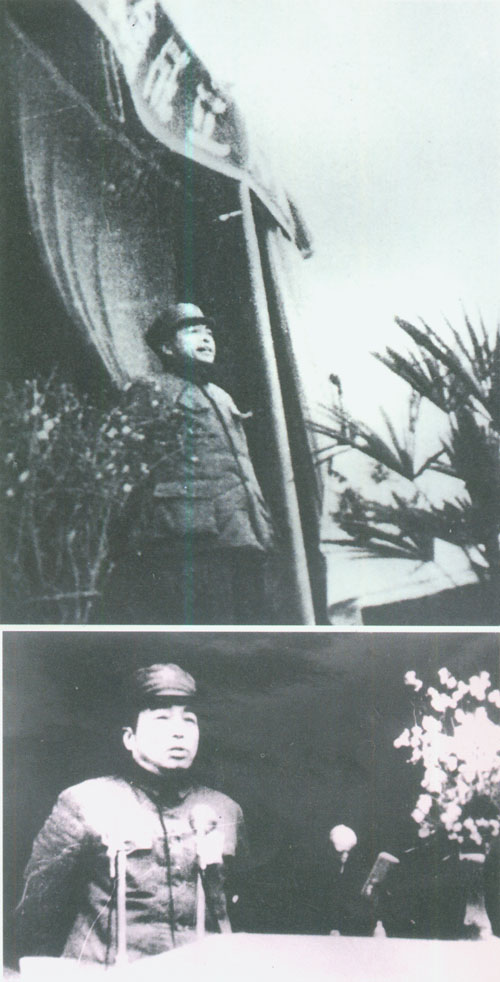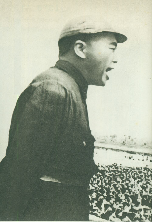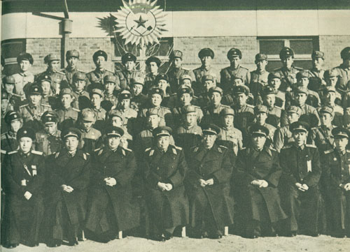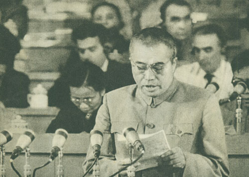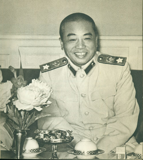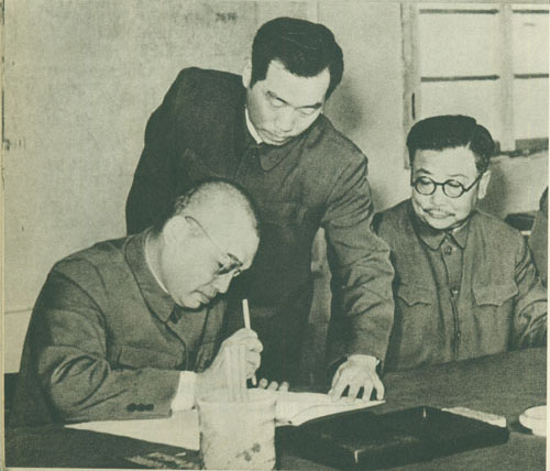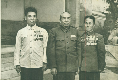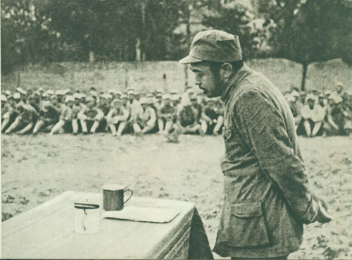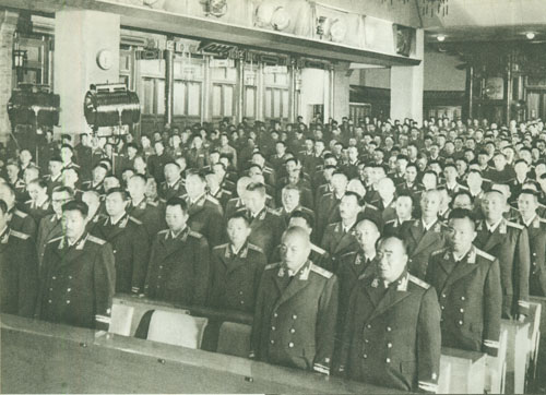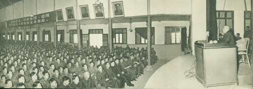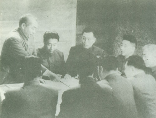 223.彭德怀1957.10.5在北京饭店向参加国庆观礼的志愿军全体代表讲话。左为志愿军司令员杨勇上将,右为政治委员王平上将。