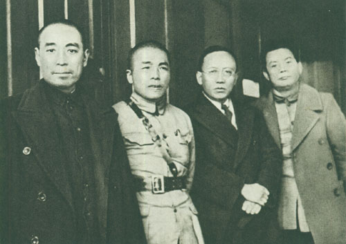 28.彭德怀1938.1为国共合作共同抗日去武汉,在汉口车站合影。左起:周恩来、彭德怀.郭沫若、叶剑英。