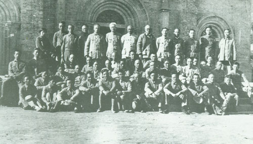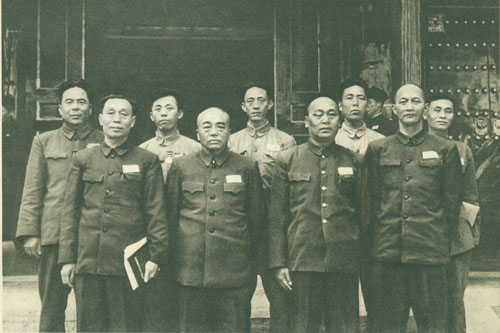 33.彭德怀1938.9同出席中共扩大的六届六中全会的部分人员合影。前排左起:高文华、彭真、曾山、张文彬(张纯清)、贾拓夫、朱理治、郭述申;后排左起:李维汉、贺龙、徐海东、朱德、彭德怀、萧劲光、萧克、滕代远。