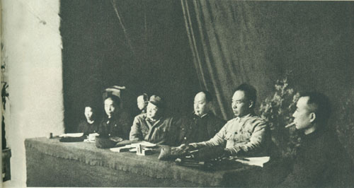 78.彭德怀1945.4.23在“七大”主席台上。右起:李富春,彭真、陈毅,张闻天,彭德怀。