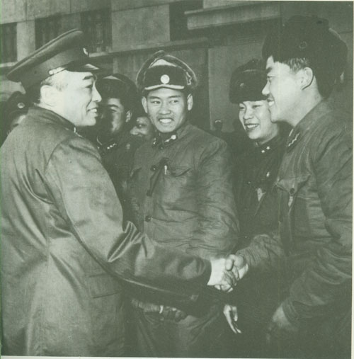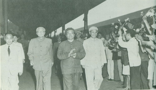 272.彭德怀1958年与贺龙元帅等在北京三座门接见部队会议代表。