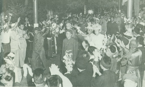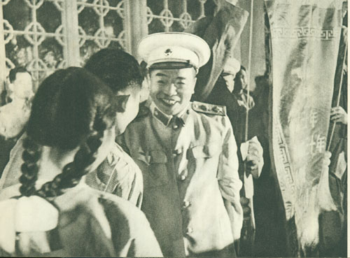 219.彭德怀1957.7.31在北京市各界两万多人举行的庆祝中国人民解放军建军30周年盛大的游园晚会上,接受首都各界人民和各民主党派献旗。