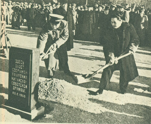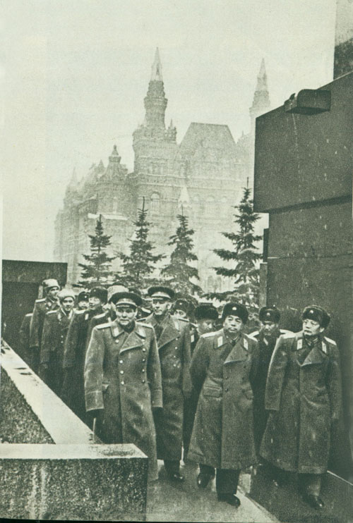 226.彭德怀1957.11.14率中国军事友好访苏团晋谒列宁、斯大林墓并献了花圈。中国军事友好访苏团的成员有:副团长叶剑英,团员粟裕、谭政、萧劲光、许光达,陈锡联,洪学智、刘震,刘志坚、萧向荣等。