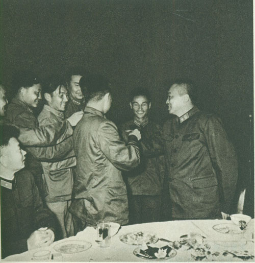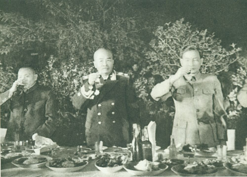 244.彭德怀1958.10.8在国防部举行的招待参加国庆观礼的解放军,志愿军代表宴会上祝酒。