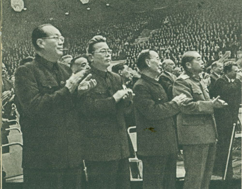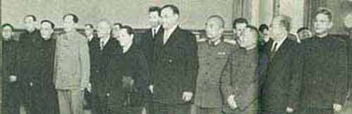 242.彭德怀1958.7.16与党和国家领导人接见出席全国妇女工作会议的代表。前排左起:李先念、聂荣臻、彭德怀、 陈毅、毛泽东、邓小平、李富春、彭真、蔡畅。