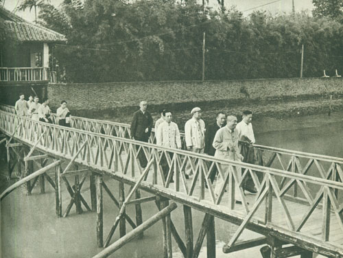 232.彭德怀1958.4.25与毛泽东、刘少奇、周恩来及工业部门的负责人在广州开会期间,休息后走过小桥,上船去开会。