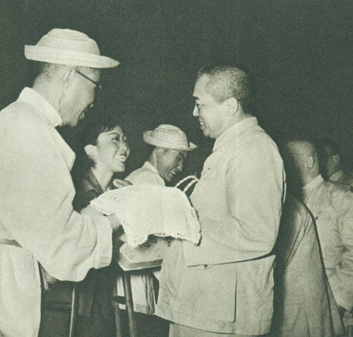 239.彭德怀1958.5.28观看四川省革命残废军人教养院的课余演出队在国务院礼堂进行的精彩的表演后,上台和演员一一握手并赞扬残废军人的高度乐观主义精神。