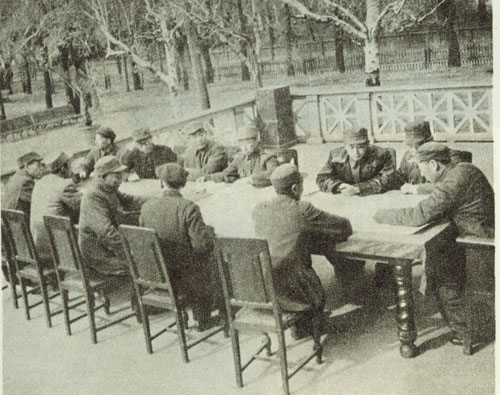 62.林彪1946年主持中共中央东北局、东北民主联军总部在哈尔层举行的高级干部会议。左二林彪(左二)、左三彭真(左三)、左四陈云、左一刘亚楼。