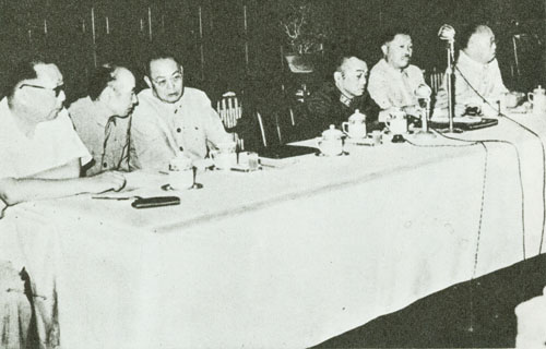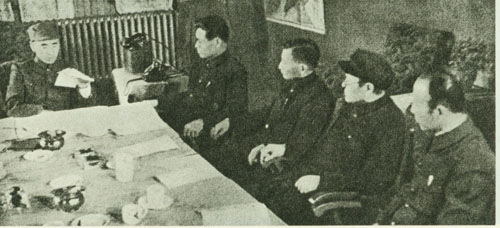63.林彪1946年主持中共中央东北局会议。左起:林彪、高岗、陈云、张闻天、吕正操。
