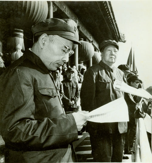 124.林彪1966.11.10与毛泽东在天安门城楼检阅游行大军。