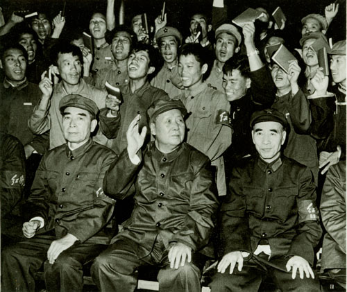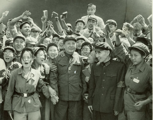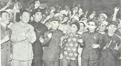 112.林彪1966.9.15与毛泽东、周恩来接见群众。