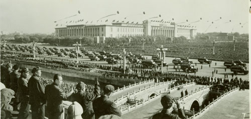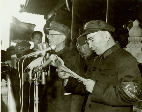 75.林彪1949.2.3与聂荣臻(左)、罗荣桓(右)在北平前门箭楼上参加人民解放军入城仪式阅兵。