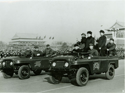104.林彪1966.8.31与毛泽东、贺龙、杨成武乘敞蓬车检阅。