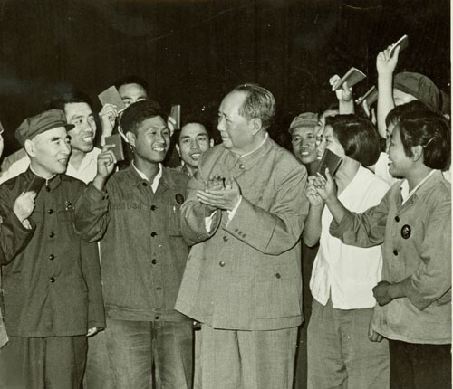 181.林彪1966.10.1与毛泽东、周恩来、康生、叶剑英接见群众。