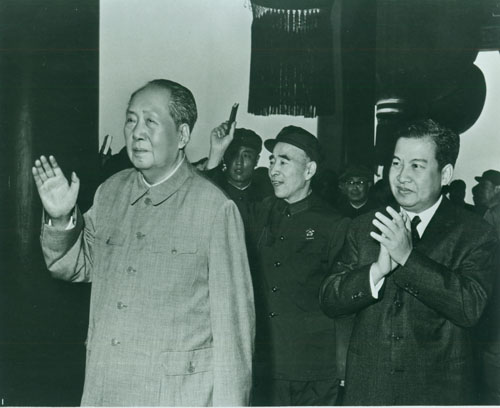 144.林彪1970.5.21与毛泽东和柬埔寨国家元首诺罗敦·西哈努克亲王在天安门城楼。