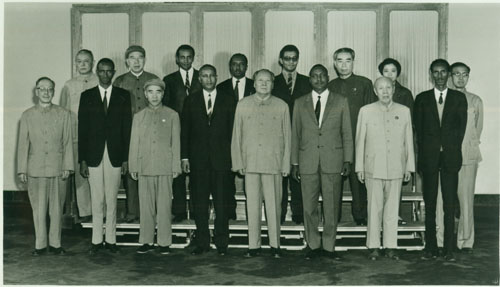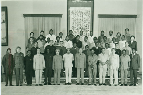 152.林彪1970年与毛泽东、周恩来会见坦桑尼亚财政部长阿米尔·贾马勒(前排左七)和赞比亚发展和财政部长伊利贾·穆登达(前排右五)以及由他们率领德代表团全体成员。