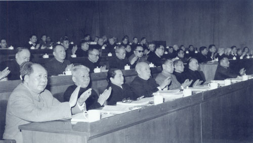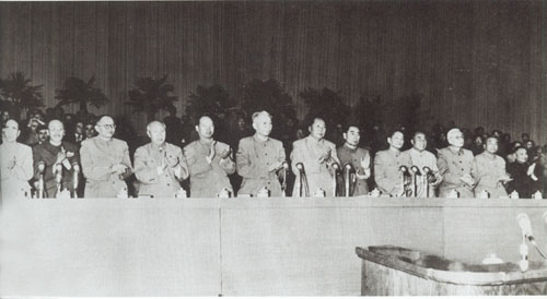 84.林彪1959.4.18出席在北京开幕第二届全国人大第一次会议。前排左起:彭真、沈钧儒、林彪、宋庆龄、刘少奇、毛泽东、朱德、周恩来、李济深、郭沫若、黄炎培、陈叔通。