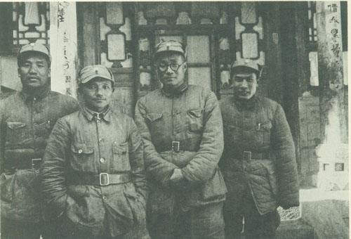 26.刘伯承1938.1与八路军129师领导人在山西辽县(今左权县)桐峪镇合影。左起:参谋长李达、政治委员邓小平、师长刘伯承、政治部主任蔡树藩。(徐肖冰摄)