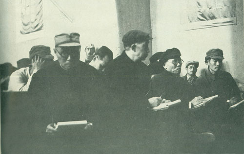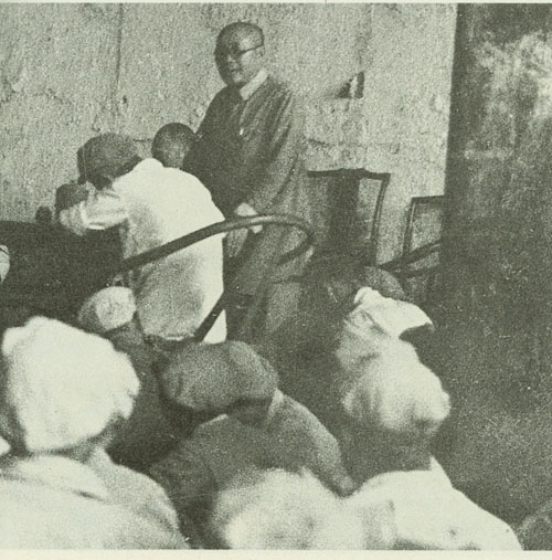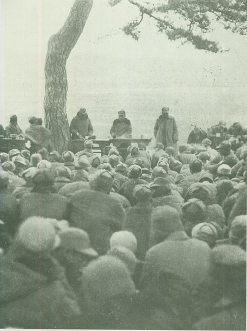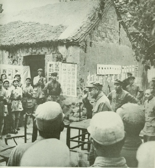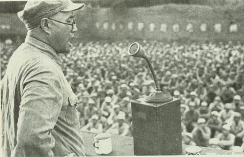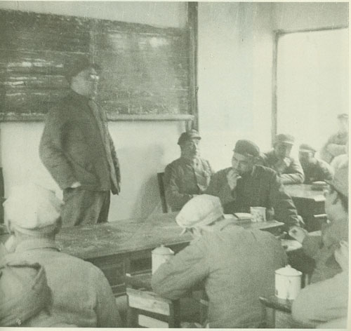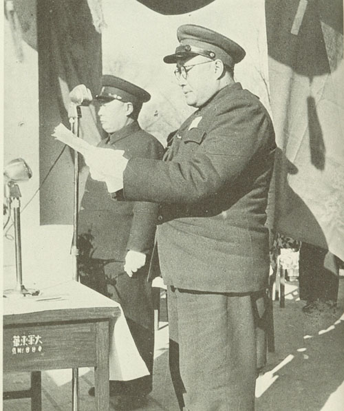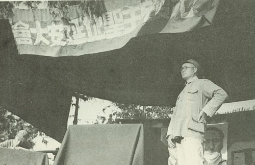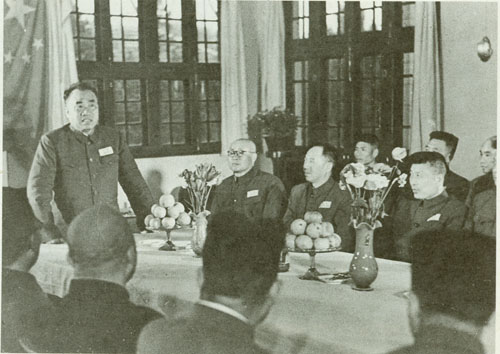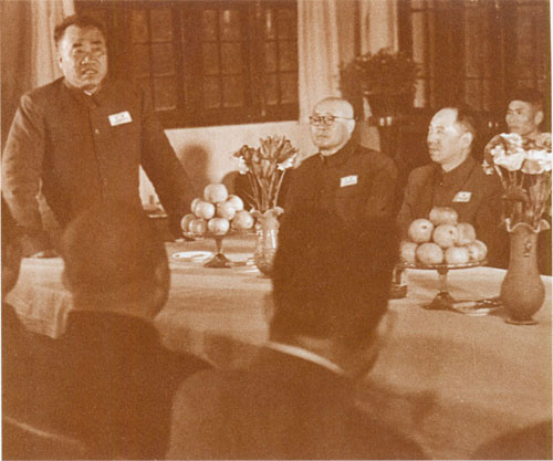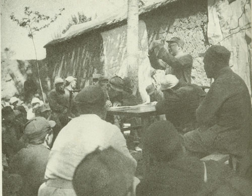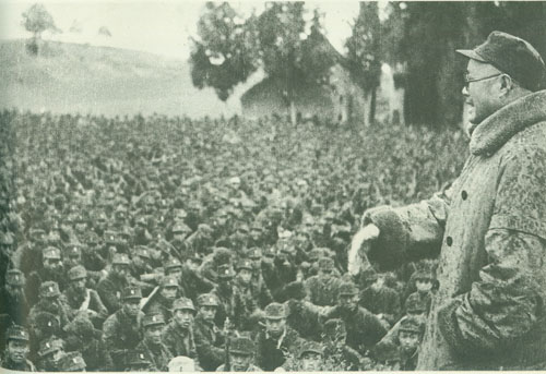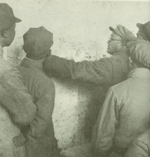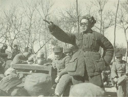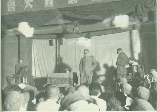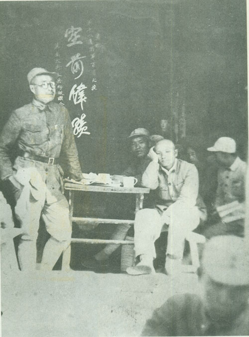 29.刘伯承1938年春在一二九师干部大会上讲话,中为政治委员邓小平,右为政治部副主任宋任穷。