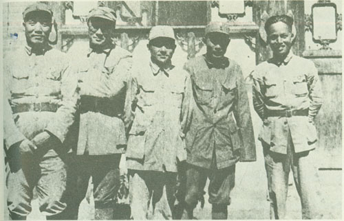 43.刘伯承1940.4于山西辽县桐峪镇一二九师师部合影。左起:一二九师参谋长李达、晋察冀军区司令员聂荣臻、一二九师政治委员邓小平、师长刘伯承、三八五旅旅长王宏坤、一二九师政治部主任蔡树藩。