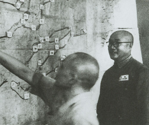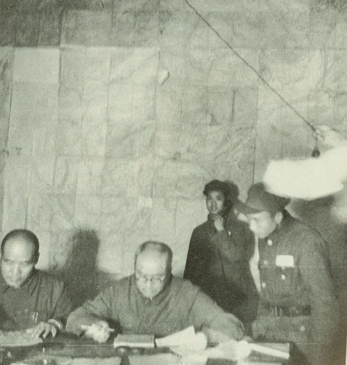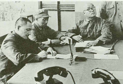 87.刘伯承1948年与李达参谋长(左一)在批阅前线部队的请示报告