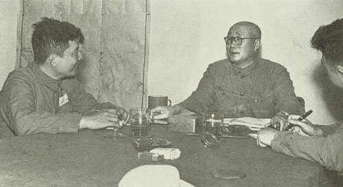 69.刘伯承1946.11.18滑县战役后,与李达参谋长(右)接见被我军俘虏的敌军104旅旅长杨显明(中)。