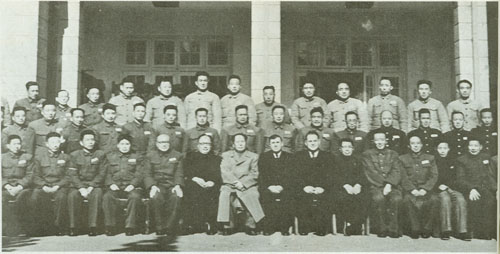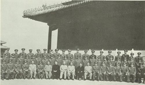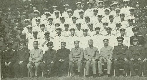 168.刘伯承1956.1陪同毛泽东及陈毅、谭震林、罗瑞卿等视察军事学院,同学院和各部、系、教授会的领导及苏联顾问合影。前排左四为杨得志、左五为刘伯承、左六为陈毅、左七为毛泽东、右四为罗瑞卿、右五为谭震林。