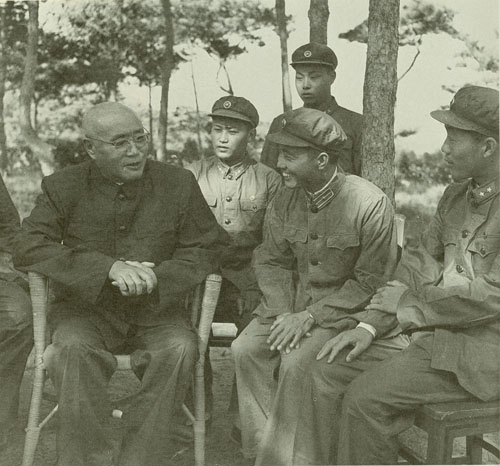 81.刘伯承1948.5与陈毅(右二)、邓子恢(右三)、李达(左一)在宝丰会议期间。右一为刘伯承。1948.5中共中央决定加强中原局的领导,以邓小平为第一书记,陈毅、邓子恢为第二、第三书记,刘伯承等12人为委员。
