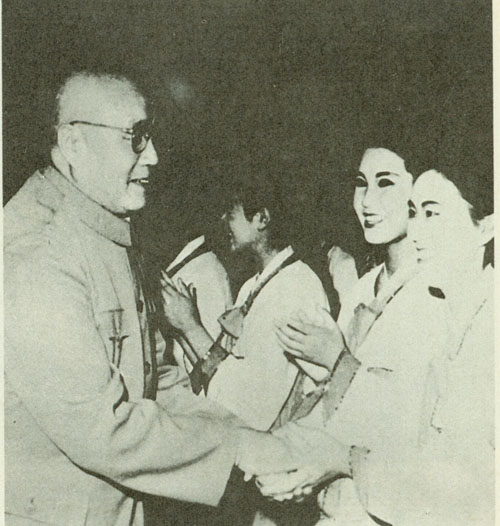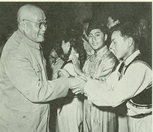 215.刘伯承1964.7.lO在延边朝鲜族自治州延吉市观看了朝鲜舞蹈。演出结束后,走上舞台,和演员们亲切握手。