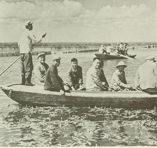 217.刘伯承1964.7在齐齐哈尔北湖,乘船观看用迷魂阵法捕鱼。