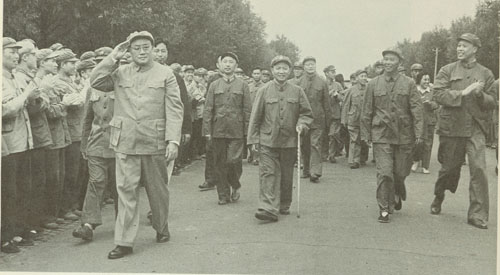 190.刘伯承1959.10陪同毛泽东等党和国家领导人接见国庆十周年部队观礼代表。前排左起:罗荣桓、陈毅、彭真、林彪、朱德、毛泽东、刘少奇、周恩来、贺龙、刘伯承。
