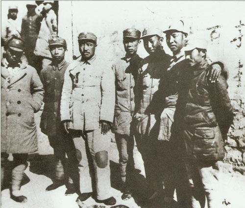 7.彭真1939.2.1在蛟潭庄欢迎贺龙、关向应率一二零师到达冀中抗日根据地大会后合影。左起:彭真、黄敬、关向应、王震、聂荣臻。