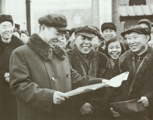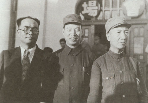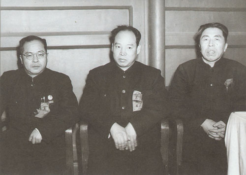 41.彭真1951.2在北京市第三届各界人民代表会议第一次会议上当选北京市市长,和副市长张友渔(右)、吴晗(左)合影。