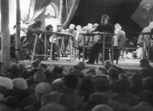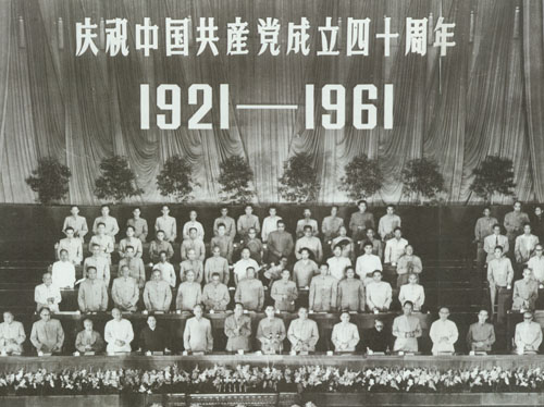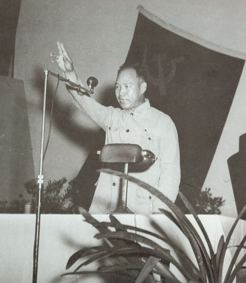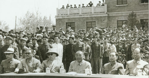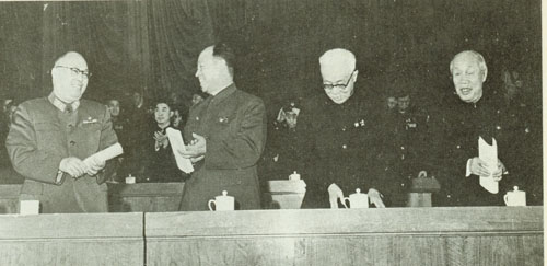 16.彭真1945.4.27—6.11出席在延安召开的中共第七次全国代表人会,作为主席团成员,并当选为第七届中央委员会委员。图为七大主席台上。右起:彭德怀、刘伯承、陈毅、彭真、李富春。