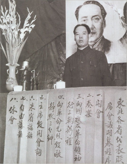 17.彭真1945.5在中共第七次全国代表大会上作《关于敌占区的城市工作》的发言。时任中共中央组织部代理部长兼中共中央城市工作部部长。右起:刘少奇、周恩来、毛泽东、彭真。