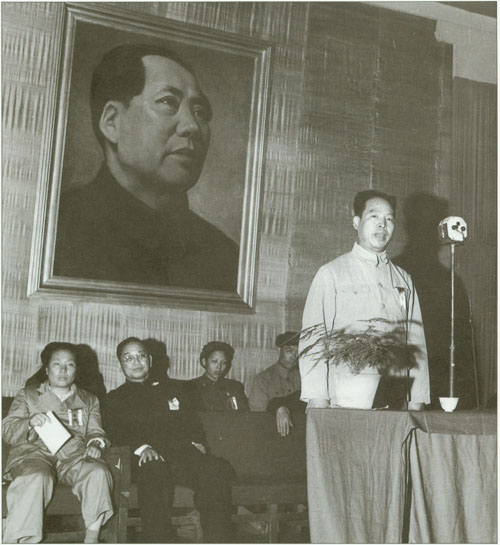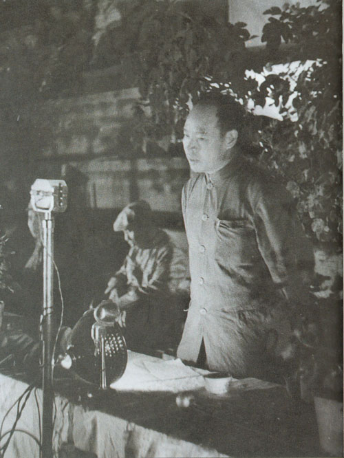 26.彭真1949.7.1在中共中央华北局及中共北平市委举行的庆祝中国共产党诞生二十八周年大会上讲话。右二为董必武。