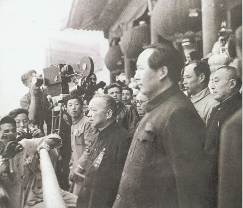 28.彭真1949.10.1在天安门城楼中华人民共和国开国大典上。右起:黄炎培、彭真、毛泽东、李济深。