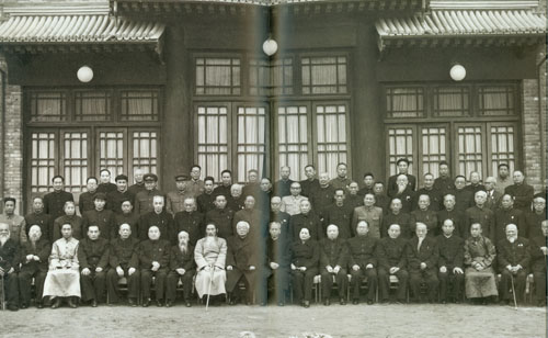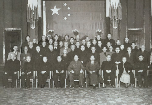 31.彭真1949.11作为北京市委书记与市长聂荣臻同北京市第二届第一次各界人民代表会议代表及会议选举的市人民政府委员合影。聂荣臻当选为市长。二排左起:张友渔、聂荣臻、彭真、许德珩;三排左一为刘仁。