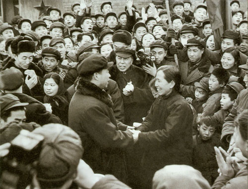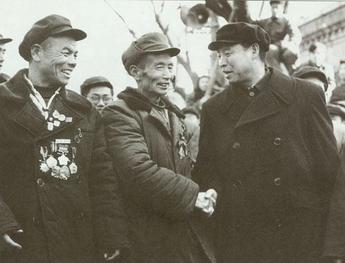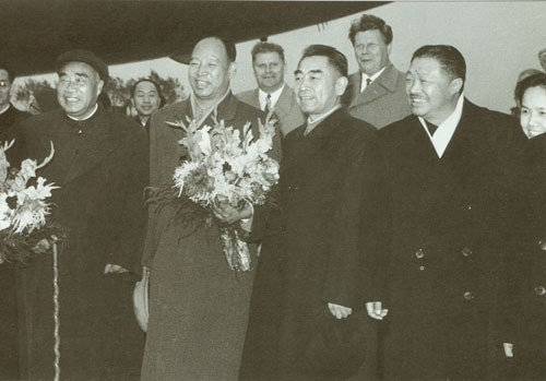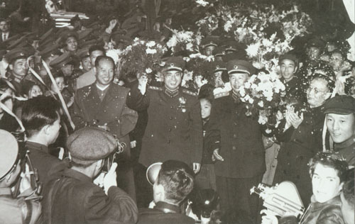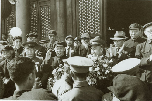 23.彭真1949.2.25在北平火车站迎候各方民主人士抵达北平。左起:叶剑英、罗荣桓、彭真、林彪、聂荣臻、董必武。