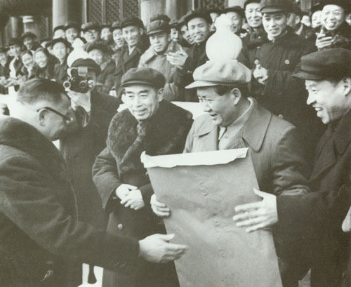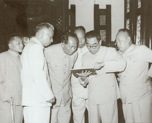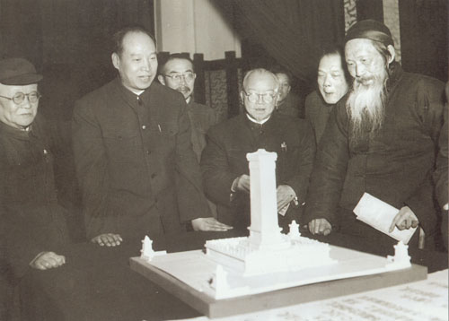 49.彭真1952.4听取张澜(右一)、李济深(左四)、邵力子(左一)等对人民英雄纪念碑设计模型的意见。