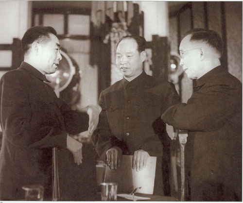 51.彭真1952.4在中央人民政府委员会第十四次会议期间同周恩来、郭沫若在一起。