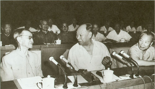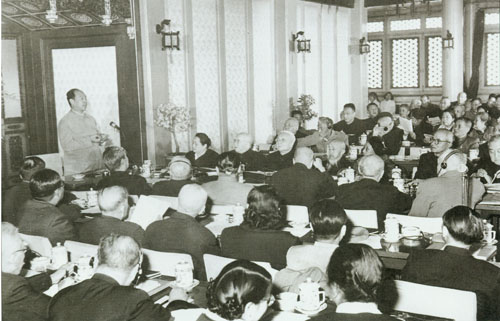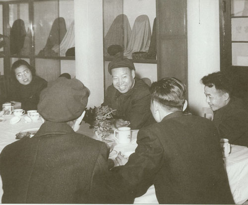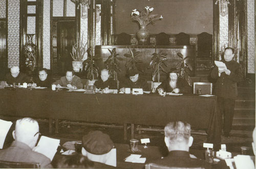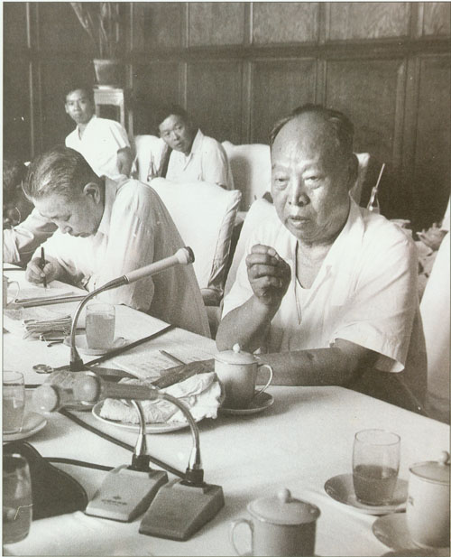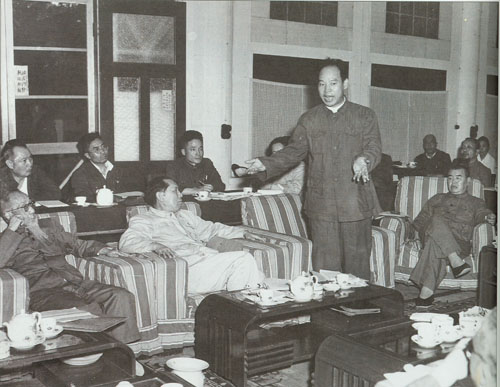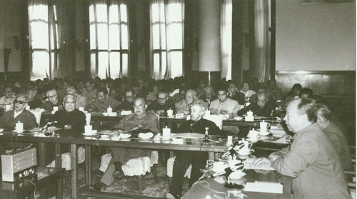 56.彭真1950.6在政协第一届全国委员会第二次会议小组会上,就土地改革问题发言。前排左起:陈叔通、章伯钧;二排左一为叶剑英;右前为邓宝珊。