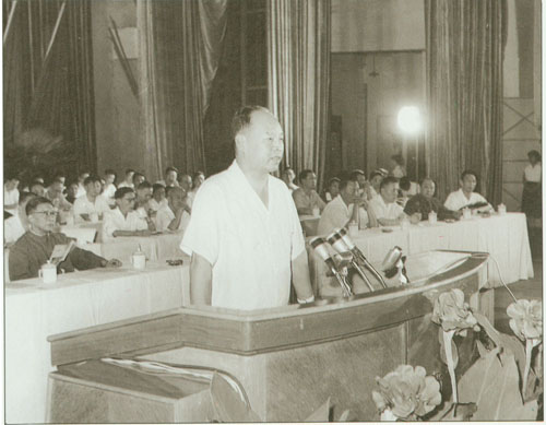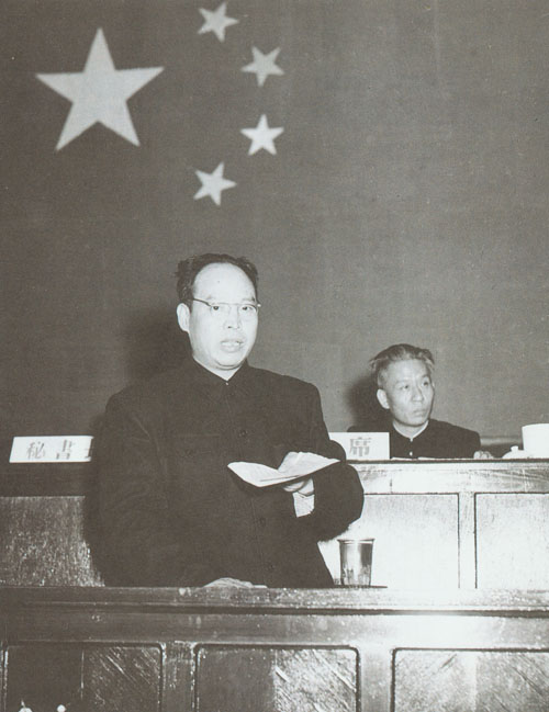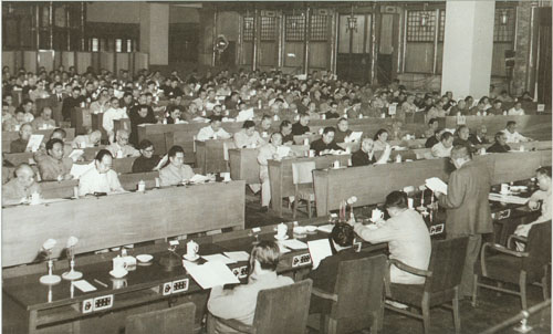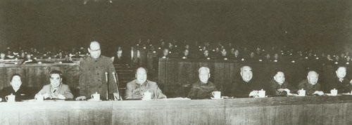 78.彭真1953.9.12在中央人民政府委员会第二十四次会议上。主席台左起:张澜、宋庆龄、毛泽东、彭德怀、刘少奇。前排左起:董必武、彭真、周恩来。
